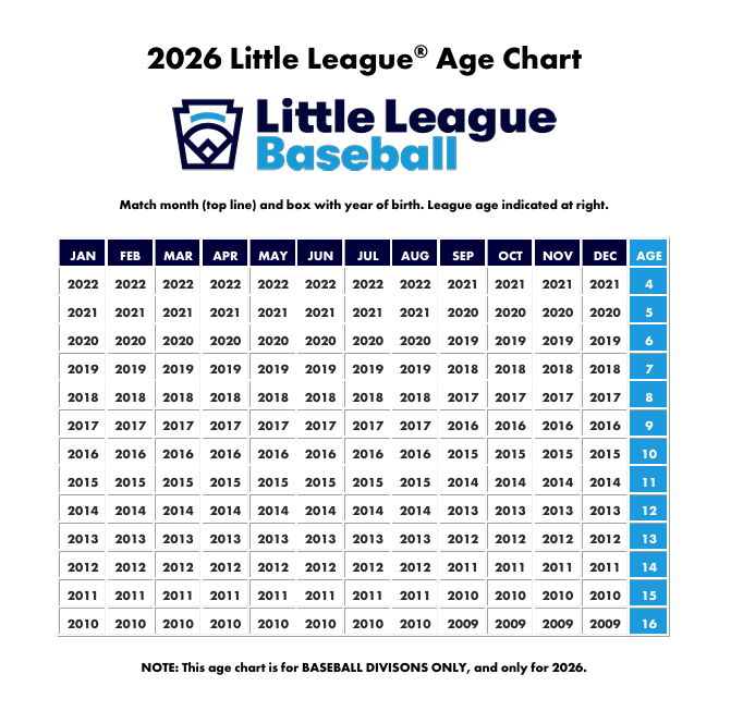 MTLL Age and Divisions:T-Ball - Ages 4-5 Minor C - Ages 6-7 Minor B - Ages 7-8 Minor A - Ages 9-10 Majors - Ages 11-12